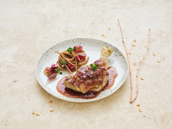 Cuisse de canette FR braisée avec une sauce au vin de Saint-Émilion et ses échalotes.