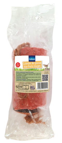 Composition : Céréales, suif de boeuf, graines, baies (2,5%), raisins (2,5%), calcium E170, colorant E124. Sans huile de palme