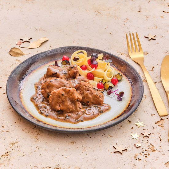 Sauté de cerf mijoté dans une sauce crème, oignons, herbes de Provence et Pinot noir.