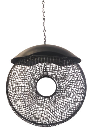 Mangeoire en métal, à suspendre, munie d'un toit de protection, pour mélange de graines. Remplissage facile par le dessus.