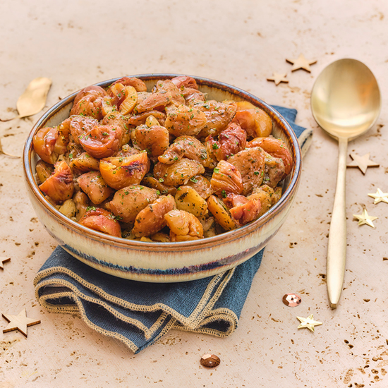 Marrons cuisinés avec échalotes, graisse de canard, persil, oignons frits, épices.