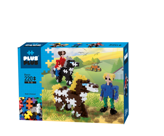Boîte de 220 pièces format Mini modèle Basic "Cavalier chevaux" de la marque Plus-Plus. La boîte contient 220 pièces et un dépliant qui propose des exemples de constructions sur le thème "Cavalier chevaux". Votre enfant peut également laisser libre cours à son imagination et créer toute sortes de personnages ou d'objets suivant ses envies.