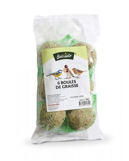 Boules de graisse avec filet Belcanto pour apporter un complément alimentaire aux oiseaux de la nature.